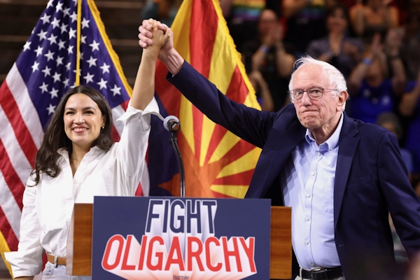 VS-volksvertegenwoordiger Alexandria Ocasio-Cortez en Senator Bernie Sanders op een “Fight Oligarchy” protest in de Mullett Arena in Tempe, Arizona, maart 2025. (Gage Skidmore/ Flickr/ CC BY-SA 2.0)