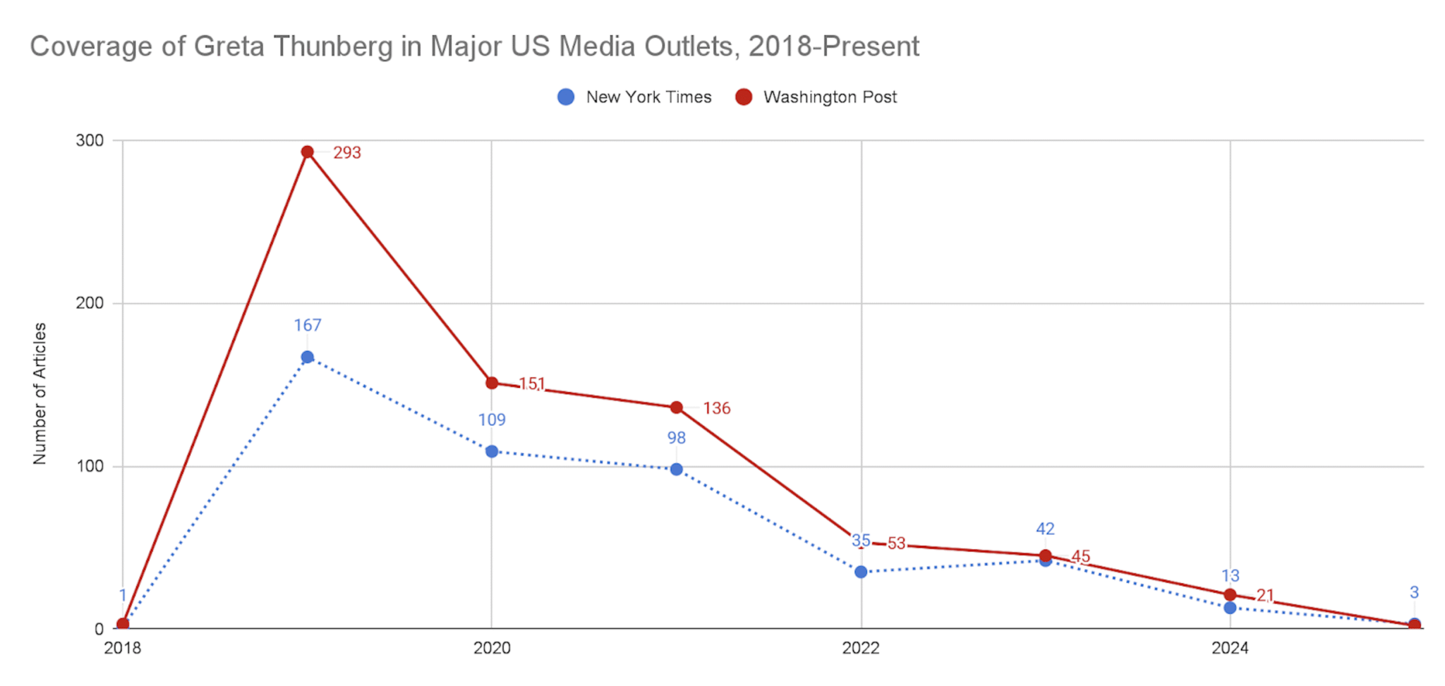 Dit fenomeen is te zien in de berichtgeving over Thunberg in The New York Times en The Washington Post. Thunberg en haar activiteiten kwamen in 2018 in de publiciteit en kregen aanvankelijk uitgebreid aandacht in beide kranten, wat neerkwam op honderden artikelen per jaar in beide media. Dit is echter in 2025 vrijwel tot nul gedaald, met slechts drie artikelen in The Times en twee in The WaPo waarin Thunberg wordt genoemd, en slechts één artikel in elke krant waarin ze uitgebreider aan bod komt dan een vluchtige verwijzing.